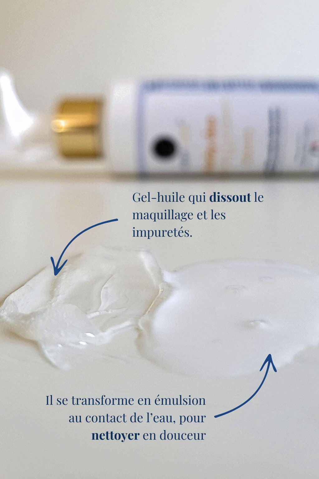 Ajoute un filet d’eau tiède pour transformer l’huile-gel en une émulsion lactée. Poursuis le massage quelques instants, puis rince abondamment.
